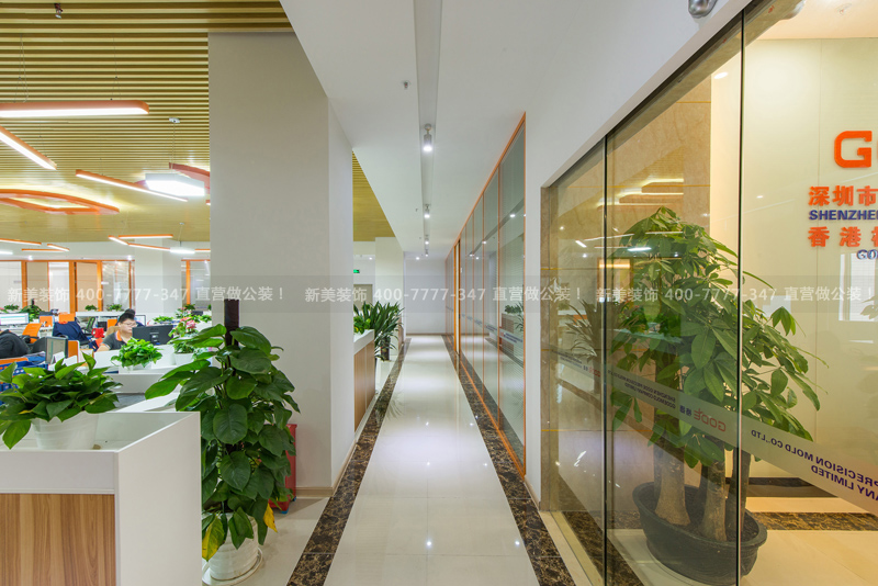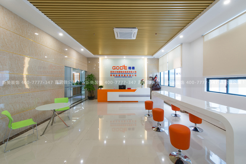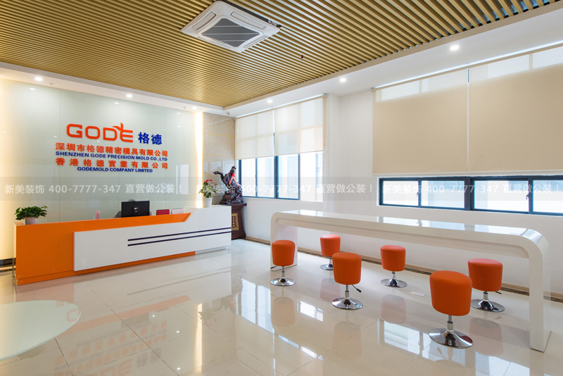 项目说明:深圳市格德精密模具有限公司(Gode Mold )是一家模具的设计和制作公司。根据企业性质的特点,设计以铝板、石材和玻璃为主要装饰用材创造功能合理、舒适优美的室内环境;采用橙、白、黄三色为主要基调色彩以体现模具需要的性能力、精密度;通过明快、简练的线条的展现现代文化的简约,同时表现出企业创新高效率的形象。空间划分直线条为主,方正的建筑空间,用直线条作空间分隔,能实现空间利用最大化。功能分区,以最能提升工作效率为依据,进行合理组合布局。 设计师将空间分为静区和动区。静区分为:经理办公室、财务室。动区分为:前台、会议室、员工办公区。静区——管理层办公与会见重要客户的区域,所以色调方面,配备了暖色系的软装。动区——服务于大众的空间,色调运用了公司的主色调黄颜色,点缀有橙色的软装与之呼应,营造出现代风格的办公空间。 入口橙色、蓝色的活力引向让人第一眼投向代表公司形象的前台,前台亮堂堂的接每个到来的客户,展现了金融企业包容性的特色文化,LOGO墙的简洁造型给人活力满满的感觉。开放式办公空间作为一个办公场所,它即满足了办公的正统模式,同时也渲染着高效办公的气氛。设计效果控制在创新、简洁、高效。通透的玻璃隔墙设计让会议室一览无余,可以看到那好似环形T台的会议桌,让每一个员工把公司当成自已的家。
